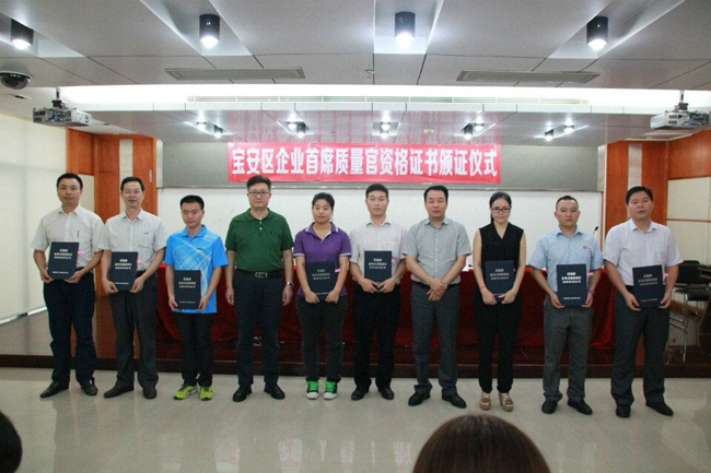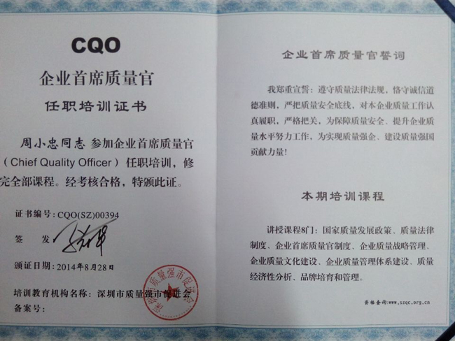 九月是全國質(zhì)量月,在深圳市副市長陳彪的指示下,深圳開展了一系列的質(zhì)量月活動,其中作為活動之一的“首席質(zhì)量官CQO培訓(xùn)考試”工作已經(jīng)告一段落。近日在寶安區(qū)市場監(jiān)督管理局舉行頒發(fā)CQO證書大會,我公司質(zhì)量部周經(jīng)理喜獲考核通過,獲得了首席質(zhì)量官證書,應(yīng)邀參加了此次頒發(fā)證書活動。