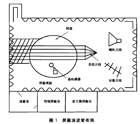 為 了 測 試操作者的安全,操作者必須被保護起來避免受到試驗場所產生的高頻和高強度電磁場的傷害。即便是在人員稀少的鄉村,開闊場地是可以接受的,但若受法律限制,至少需要一個屏蔽室。由 屏 蔽 室改造的,具有部分隔襯的屏蔽室,是使用一定數量的能吸收射頻(RF)的材料來抑制無隔襯屏蔽室的主諧波。假如能建立一個均勻場,進行的輻射抗擾性測試就可得到承認。另 一 方 面,考慮到機器人的尺寸,在對機器人進行輻射抗擾性測試期間,要達到一個較好的均勻場,推薦使用屏蔽消波室。即使局部隔襯的屏蔽室沒有消波室那么寬敞。圖 1 給 出了一個適合進行機器人 EMC測試的屏蔽消波室的布局。除消波室之外,在機器人輻射抗擾性測試期間,一些鄰近的屏蔽室通常用于放置與機器人相關的測試儀器和設備。另 外 ,使 用適當的天線(即多股的傳輸線)和采用適當的測試設備可改善電磁場的均勻性。